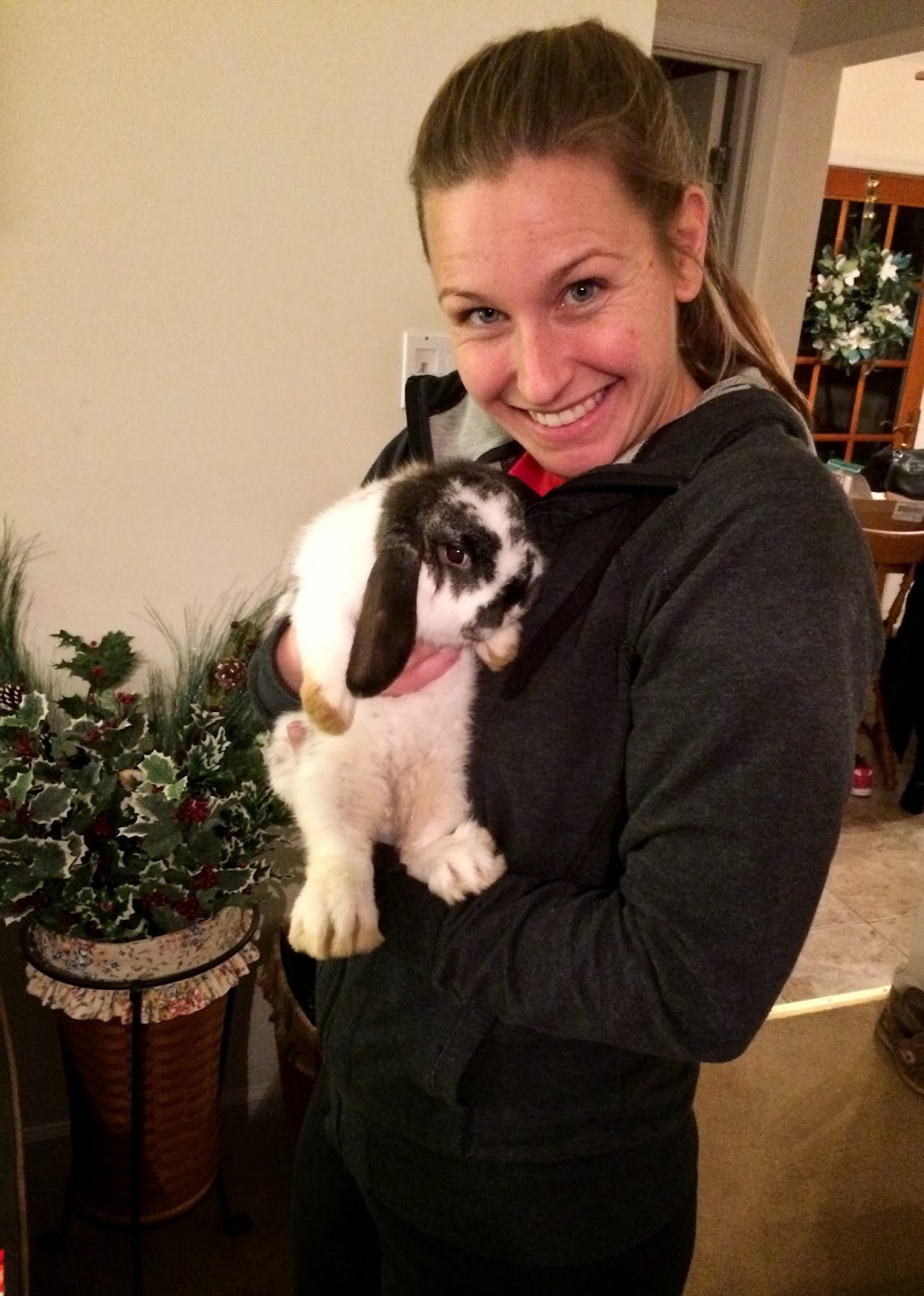 Starving and with a 1/4 tank gas we pulled into a driveway (after passing it and having to turn around at the next house) to be greeted by a high school student with a big blue tub filled with 4 ten week old bunnies. 2 grey, 1 black, and 1 brown/grey and white.
